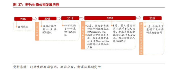 创新药研发领域的领军者,聚焦大市场+大病种。轩竹生物是四环旗下的创新药研发平台,成立于 2002 年,是一家聚焦于肿瘤、代谢性疾病、消化、感染等领域的创新型生物制药公司。2008 年四环收购了轩竹生物 60%股权,随后在 2012 年完成了对全部股权的收购。轩竹生物自成立至今,在创新药领域的投资已超 20 亿,目前已经形成完整的新药研究开发体系,具有从新药结构设计、评价、确立候选化合物,到临床研究,再到新药上市申请的专业平台。2020 年 8 月,轩竹生物完成了首轮股权融资,引入了国投招商等私募、基金公司,投入资金共计 9.6 亿元,投后估值达到 45 亿元。