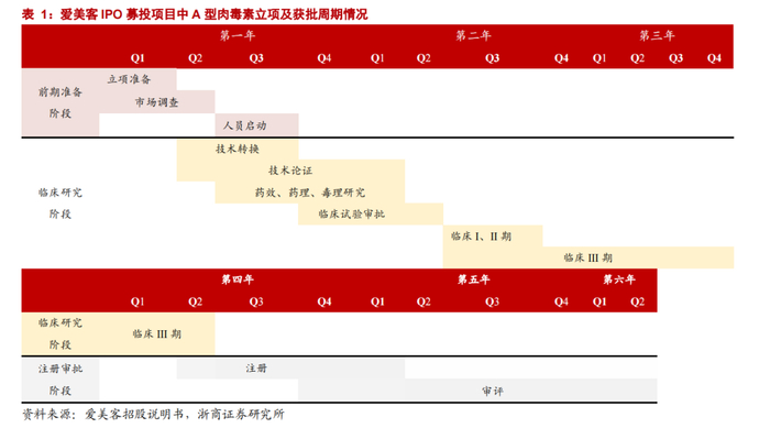 牌照认证周期较长。由于肉毒素的毒麻类属性,注射风险较大,因此针对肉毒素的监管较严苛。肉毒素的牌照认证周期较长,肉毒素认证牌照的审核周期通常需要 8-10 年左右。以爱美客 A 型肉毒素研发项目为例,预计从立项到获批完整周期在 5 年以上。
