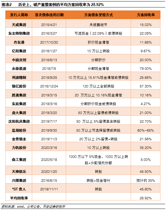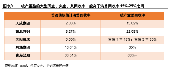 破产重整是给公司争取“喘息时间”的常规手段,也是未来市场投资者需要转变的预期。我们曾在此前的专题《打破刚兑六周年,我国信用债违约回收及处置实践》中提到,债务违约后,债权人可以采取违约求偿诉讼,为了控制发行人恶性转移其有效财产,违约求偿诉讼往往伴随着财产保全。然而,一旦公司陷入债权人纷纷提起求偿诉讼、要求冻结资产的恶性循环中,很容易造成无序挤兑,导致公司正常经营无法顺利进行,加剧流动性的恶化。但若法院裁定受理了破产申请,则未到期债权自动到期、此前的财产保全自动解除,这时同一债权组的所有债权人将会被拉到“同一起跑线”上,也可以为公司主动处置资产、引入战投、统筹各方利益提供时间窗口,给公司自身争取“喘息时间”。