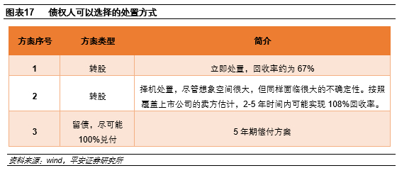 但站在2019年末的时点,投资者面临的实际上是以下三种方案或者他们的组合:(1)留债,5年期,100%兑付;(2)转股,即期兑现,67%回收率;(3)选股,择机兑现,回收率不确定。我们翻阅了在盐湖股份破产重整方案发布的时点附近的、覆盖这一上市公司的卖方研究,评估钾肥价格处于低点,公司股价未来有约60%的向上空间。考虑到折价转股,未来60%的上涨能够完全兑现,投资回收率为108%,未来2-5年有一定的实现概率。不同的投资者可以根据股票表现的预期和债券现金流的预期,依据自己的风险偏好选择合理的方案组合。
