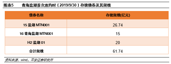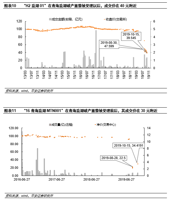 2019年8月中旬公司公告其被债权人申请破产重整后,公司的存续债券价格大幅下跌,9月底公司公告其破产重整已被法院受理,公司违约时存续3只债,“H2盐湖01”、“15盐湖MTN001”和“16青海盐湖MTN001”的价格基本都跌至了30-40元的区间。