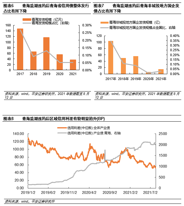 作为地方国企的实际掌控者,地方政府的目标是尽可能维持企业稳定运营、保持就业,同时在短期债务减记和长期区域融资环境利益之间做出平衡,前者是底线,后者体现了各地政府施政能力和艺术性。信用违约确实影响区域融资,以青海为例,违约后青海发债规模从2019年全年的116.3亿元下降至2020年的55.25亿元,非城投国企的发债占比约从0.09%下降至2020年的0.01%。青海省产业债信用利差飙升,从违约时的200bp上升至目前的2000bp左右。