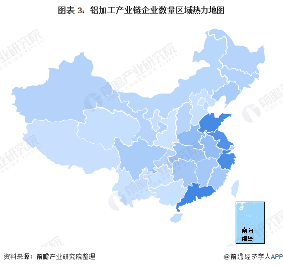 铝加工产业链区域热力图:各省企业数量较多,产能分散,市场集中度较低