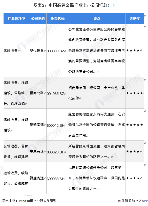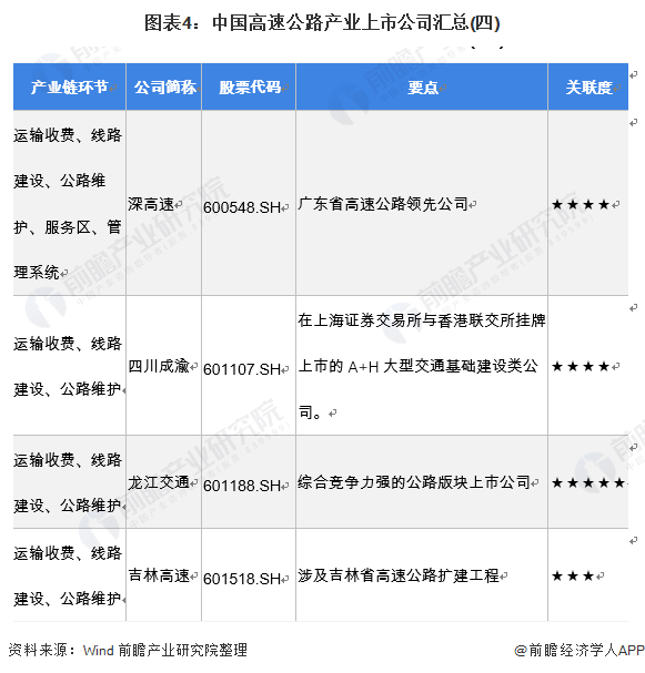汇总目前中国高速公路产业链运营公司,中国高速公路运营公司包括具体包括:盐田港(000088.SZ)、粤高速A(000429.SZ)、湖南投资(000548.SZ)、山西路桥(000755.SZ)、东莞控股(000828.SZ)、城发环境(000885.SZ)、海南高速(000886.SZ)、现代投资(000900.SZ)、招商公路(001965.SZ)、皖通高速(600012.SH)、中原高速(600020.SH)、福建高速(600033.SH)、楚天高速(600035.SH)、重庆路桥(600106.SH)、赣粤高速(600269.SH)、山东高(600350.SH)、五洲交通(600368.SH)、宁沪高速(600377.SH)、深高速(600548.SH)、四川成渝(601107.SH)龙江交通(601188.SH)、吉林高速(601518.SH)