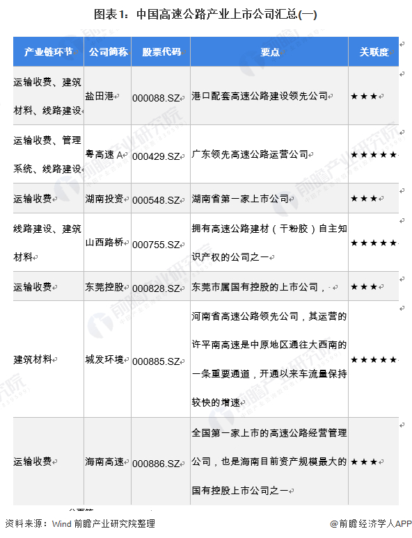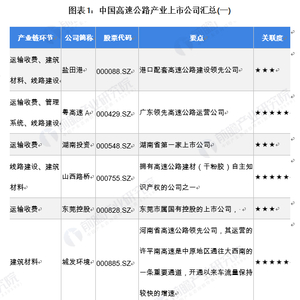 中国高速公路产业包括公路建设、公路运营、公路维护三大环节。公路建设主要包括线路建设、建筑材料、机械设备、公路绿化;公路运营包括运输收费、服务区、管理系统;公路维护包括养护设备、养护材料,自20世纪90年代中期实施招投标制度以来,中国的高速公路施工业形成了完全开放的自由竞争市场,市场准入门槛的放开刺激了整体行业的快速增长。本文对高速公路产业上市公司进行了汇总,并从公司的业务布局、业绩对比及业务规划进行全方位对比。