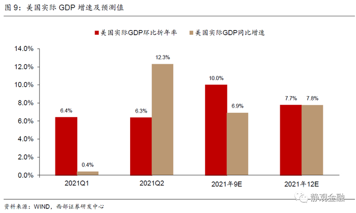 服务消费向好才是美国经济强劲的保障。亦如图8可知,随着疫情约束逐渐消退,5月以来美国个人消费重心开始由耐用品向服务切换,6月美国个人服务消费支出首次超越疫前(2020年2月)水平。事实上这一转变非常利好美国经济。首先,耐用品消费对美国经济正向贡献有限,降温也不会导致经济下行风险,原因有二:一方面耐用品多为进口商品,消费增加的同时也加大贸易逆差,对实际GDP贡献几乎抵消;另一方面耐用品消费上升会加剧输入型通胀,对美国经济前景存在一定威胁。相反,服务消费偏向内生,该消费分项上升利好美国经济:目前服务消费刚刚恢复到疫前水平,仍有空间;解封后,报复性服务消费需求大概率推动Q3经济加速改善。我们预计Q3或现年内美国实际GDP环比折年率高点。