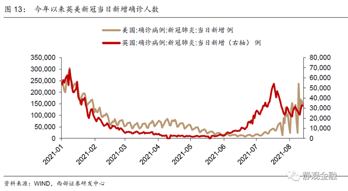 市场确实在意这一数据,但消费者信心有望于9月回升。8月13日密歇根大学消费者信心指数公布后,美元指数与10年期美债收益率明显回落,表明市场还是很在意这一主观数据的。但我们认为该指标有望在未来1-2个月内触底回升。5月美国通胀就已明显走高,但消费者信心并未大幅回落,表明疫情反弹才是7月该指标骤降的关键。7月议息会议上美联储主席鲍威尔指出过去一年的经验是每一波疫情对经济的冲击在逐次减弱。并且英国当日新增确诊人数已经从高位回落,加上疫苗混打有望进一步缓解疫情压力,因此美国疫情有望在Q3后期明显缓和。