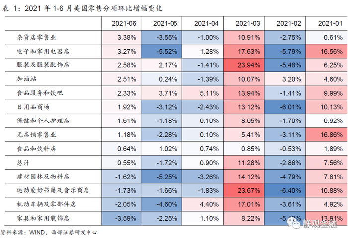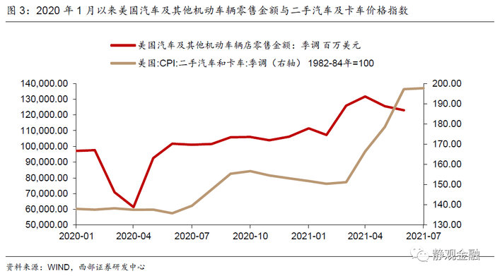 (1)就业及服务消费等客观数据表现强劲。首先,7月31日当周美国续请失业金人数降至286.6万人,与2013年5-8月水平相当。6-7月美国新增非农就业人数均超90万人。结合二手车价格飙升可知,大量低收入群体回归就业市场。此外,疫情约束逐渐消退,个人消费结构呈现跷跷板特征,5月以来耐用品消费降温、服务消费反弹。