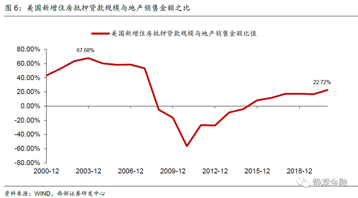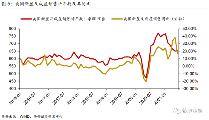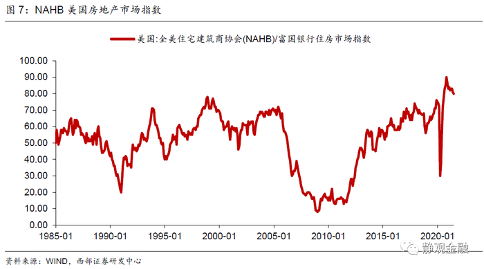 疫后美国地产销售陡增与购房周期缩短等因素有关;就业恢复令购房周期重新拉长回疫前水平,地产销售降至合理水平。2020年5月美国新屋销售跳升、6月超越疫前水平,7月成屋销售亦开始显著高于疫前。很多人认为这是疫后低利率的结果,但结合图6可知,2020年美国住房抵押贷款量并不大。可见疫后美国地产销售火爆另有原因,我们认为原因有两点:一是疫情极大地刺激了民众改善型住房的需求,加上远程办公成为可能,也会有很多人愿意在郊区购房;二是疫后出行受约束甚至不用“上班”的状态令购房者加速看房,购房周期进而缩短。此外,从住房抵押贷款与地产销售金额比值亦可看出疫后购房者以不太需要大规模贷款的中产和高净值群体为主,而这一群体今年已经快速回归工作岗位,购房周期被自动拉长回到疫前水平。加上改善型住房或已部分兑现,进而今年以来美国地产销售热度降温。此外,NAHB房地产市场指数反映美国地产景气度,今年以来该指标有所回落,但7月仍为80,而疫前最高水平也只有78,表明美国地产商仍看好美国地产市场,今年销售回落属于预期之内,是向合理趋势水平回归的结果。