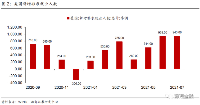 6月以来美国就业数据加速改善。如图1所示4-5月续请失业金人数处于平台期,但6-7月再次大幅回落。截止7月31日当周美国续请失业金人数降至286.6万人,大幅低于5月底的351.7万人,与2013年5-8月水平相当(2013年5月22日美联储时任主席伯南克官宣Taper)。此外,6、7月美国新增非农就业人数分别为93.8万人及94.3万人,接连创下2020年9月以来最佳。