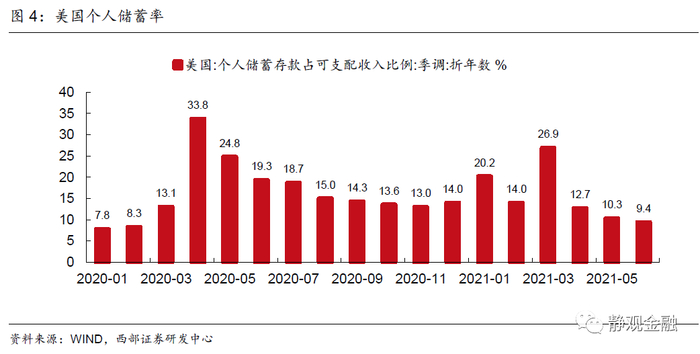 二手车价格大涨表明近期回归就业市场的主体为低收入群体。如图3所示,美国二手车价格指数5月有所上浮,而6月更是大幅跳升。很多人认为这是全球缺“芯”导致一手车供给不足的结果。但零售数据中的汽车及其他机动车辆分项包括80+%(每个月会略有波动)一手车销售数据及20-%的二手车销售数据。4月该分项跳升大概率与美国第三轮抗疫刺激又给老百姓发了支票有关,随后5-6月该指标略有下降但仍明显高于3月,表明一手车销量并不差。结合零售及二手车价格指数评估,我们认为二手车价格突然暴涨与低收入群体加速回归就业市场有关。截止6月底美国有22个州提前结束了疫后失业救济金,截止8月10日这一数字进一步提高至26个 。此外,7月4日以来美国基本全面解除疫后防疫措施,低收入群体就业意愿明显上升。但碍于Delta病株的高感染性搭乘公共交通上下班存在感染风险,因此购买价格相对低廉的二手车成为低收入群体回归就业市场的“标配”。此外,大量低收入群体回归就业市场说明美国经济系统性风险进一步降低。