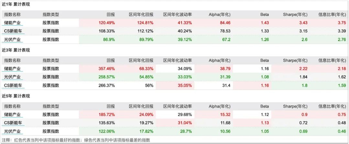 从近一年以来各项指标的表现来看,储能产业居然遥遥领先。近一年上涨120.49%,CS新能车上涨108.33%,光伏产业上涨86.90%。夏普比率(年化)3.43,CS新能车夏普比率(年化)3.15,光伏产业夏普比率(年化)2.60。信息比率(年化)3.75,CS新能车信息比率(年化)3.39,光伏产业信息比率(年化)2.76。从近三年和近五年以来各项指标表现来看,储能产业同样是最佳。