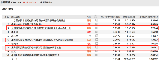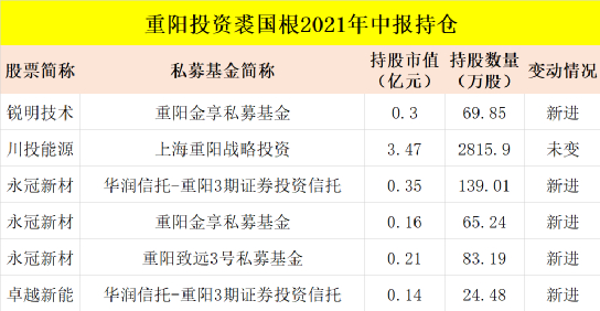 8月17日晚间永冠新材发布的中报显示,裘国根管理的华润信托-重阳3期、重阳致远3号、重阳金享私募基金等三只产品新进该股前十大流通股东名单,合计持有287.44万股,期末持股市值为7200万元左右。同时,陆股通也增持了该股。