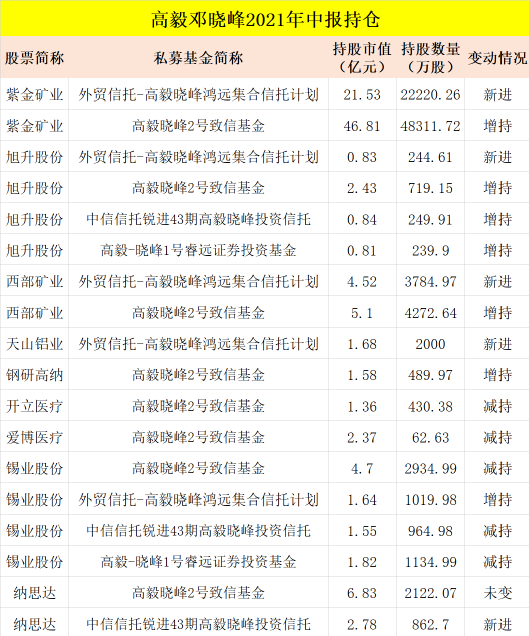 但是邓晓峰加仓了紫金矿业、西部矿业、天山铝业等上游资源类公司,旗下两只产品合计持有紫金矿业7.05亿股,二季度末持股市值为68.34亿元。