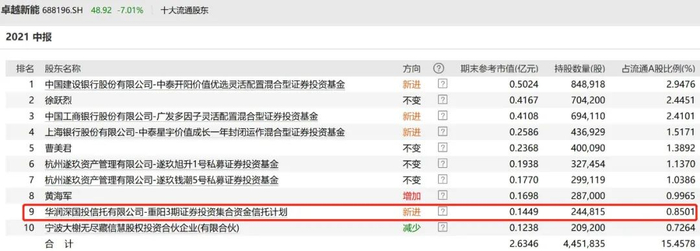 科创板企业卓越新能公布的中报也显示,华润信托-重阳3期新晋为第九大流通股东,持有24.48万股,期末持股市值为1449万元左右。同时,唐晓斌管理的广发多因子灵活配置基金业新进了该股,持有69.41万股。
