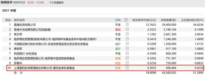 锐明技术公布的中报显示,重阳金享私募基金新进前十大流通股东名单,持有69.85万股,期末持股市值为3032万元。同时外资施罗德投资增持了该股,施罗德中国进取股票基金、施罗德环球基金系列中国A股合计持有199.96万股;陆股通也增持了锐明技术,持有518.82万股。