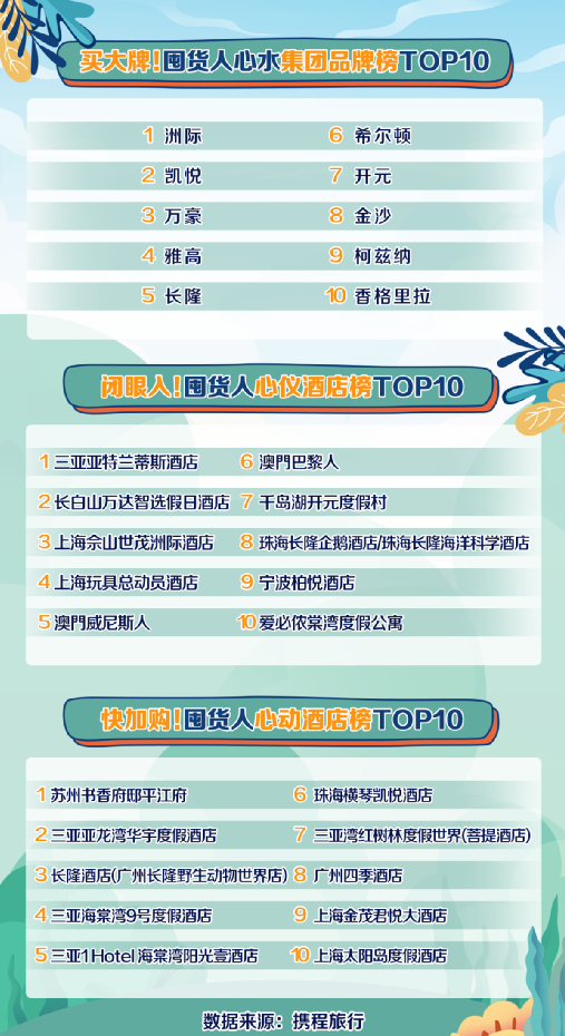 从“囤货”订单量同比增幅来看,Top10酒店为:苏州书香府邸平江府、三亚亚龙湾华宇度假酒店、长隆酒店(广州长隆野生动物世界店) 、三亚海棠湾9号度假酒店、三亚1 Hotel 海棠湾阳光壹酒店、珠海横琴凯悦酒店、三亚湾红树林度假世界(菩提酒店)、广州四季酒店、上海金茂君悦大酒店、上海太阳岛度假酒店。