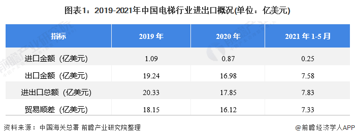 2021年1-5月,中国电梯行业进出口总额为7.83亿美元,其中,进口额为0.25亿美元,出口额为7.58亿美元,实现贸易顺差7.33亿美元。总体来看,我国电梯行业受国内外疫情影响较为明显,进出口规模减小,贸易顺差也呈现缩减趋势。