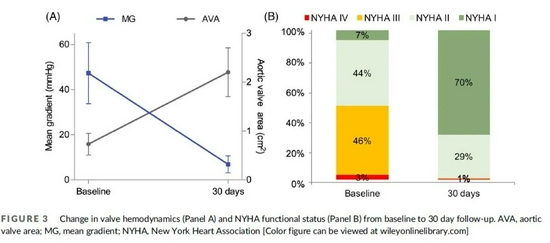 左:瓣膜血流动力学基线至30天随访的变化右:NYHA心功能基线至30天随访的变化(AVA:瓣膜面积;MG:平均压差)