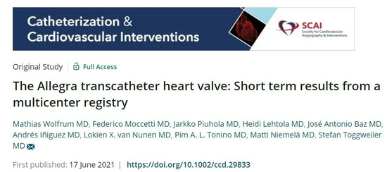 2021年8月,蓝帆医疗旗下Allegra™经导管主动脉瓣膜来自真实世界的多中心临床研究30天随访结果在Catheterization & Cardiovascular Interventions期刊正式发表。Catheterization & Cardiovascular Interventions(IF=2.692)是美国心血管造影和介入协会(SCAI)的官方期刊,代表来自超过75个国家的从事心血管导管术领域的医生、医疗保健专业人员和科学家。