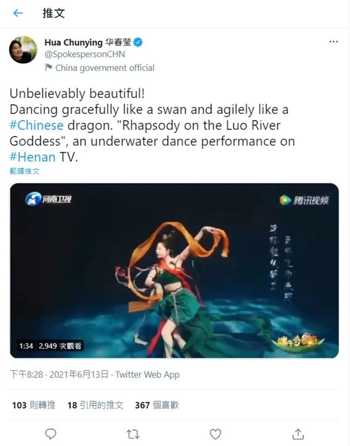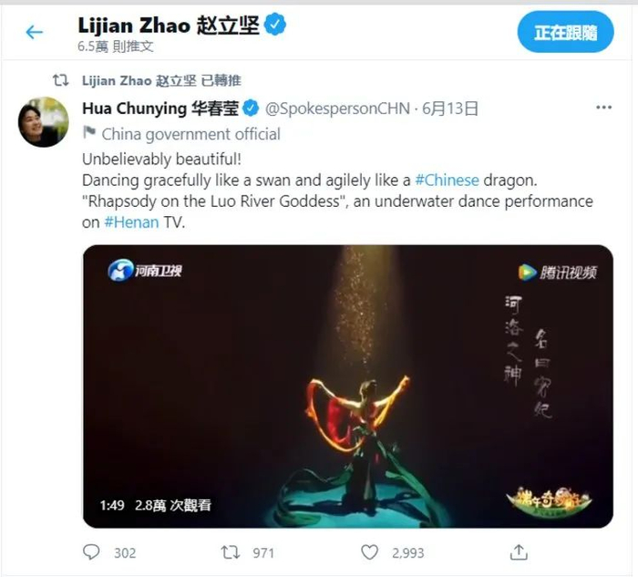 6月12日晚,河南卫视《端午奇妙游》播出,水下舞蹈节目《洛神水赋》又一次出圈,同样吸引到华春莹的关注。