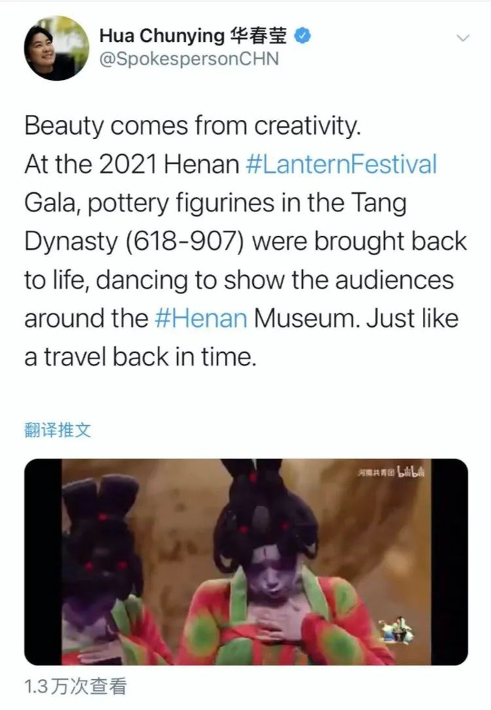 华春莹在推特上发文为“唐宫小姐姐”们打call。她说:“美来自于创造力。在2021年河南元宵晚会(元宵奇妙夜)上,唐朝(618-907)陶俑复活,舞动着向观众们展示了河南博物院。就像时光倒流一样。”