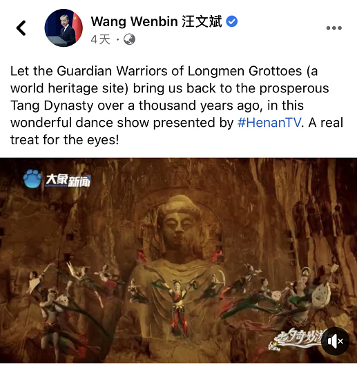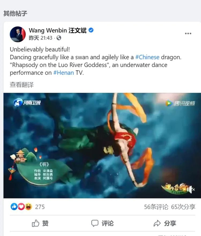 汪文斌在脸书个人账号上发出同样的内容。赵立坚也使用个人推特转发了华春莹点赞《洛神水赋》的推文!