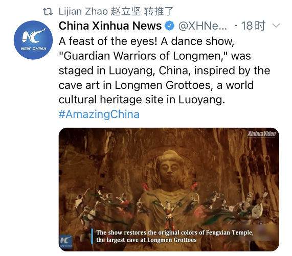 “在河南卫视精彩的舞蹈表演中,龙门石窟(世界遗产)的守护金刚带我们回到了一千多年前的繁荣唐朝。一场视觉的盛宴!”