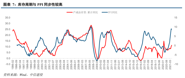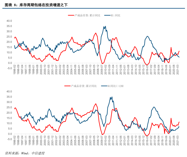 企业流动性(M1)与库存呈现反向关系。一般来说产成品库存对企业的流动性有一定的占用,从过去几轮库存周期来看,企业流动性的低点往往对应产成品库存的高点;企业流动性的高点往往对应产成品库存的低点。而从领先性角度来到看,一般企业流动性高点往往领先产成品库存增速高点四个季度左右。本轮M1高点出现在2020年11月,产成品库存增速在下半年也将迎来拐点。