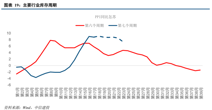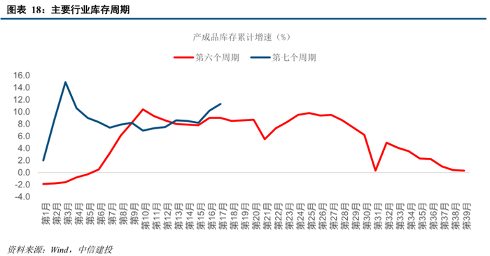 这里我们比较上一轮库存周期和本轮库存周期,这两轮库存周期都存在供给层面受到约束的情况。第六个周期由于我国进行供给侧改革,出现价格上行,供给收缩的局面,产成品库存增速连续20个月处于相对高位。我们观察一轮库存周期节奏与第六轮存在周期存在相似之处,PPI价格处于高位,大约再延续半年,产成品库存增速也将继续保持一个相对高位半年左右的时间。