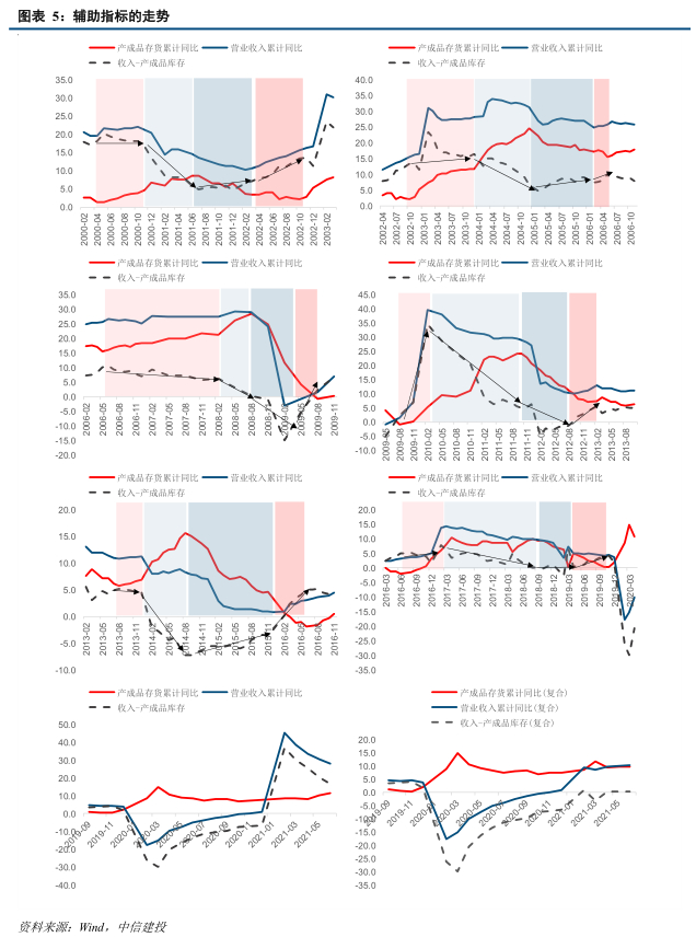 除了比较营业收入累计增速和产成品库存累计增速的位置外,我们使用营业收入-产成品库存增速作为辅助指标,来判断库存周期。从收入角度看,我们用收入增速-产成品库存增速来判断企业的库存增速是否与收入增长相一致,如果收入增速大于库存,则企业有补库存的空间;反之表明企业销售及库存压力。