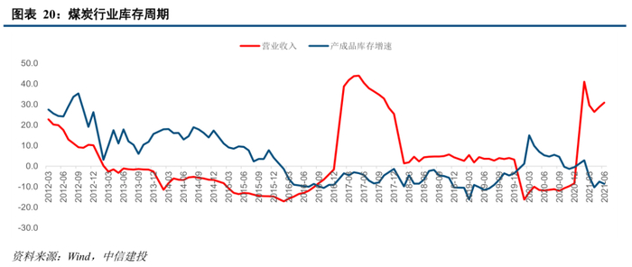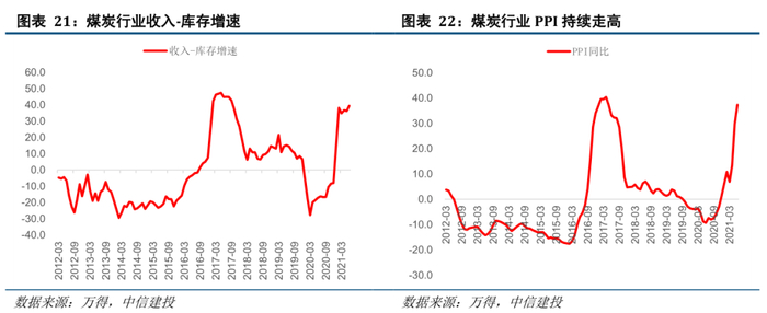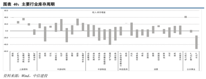 整体上看,上游原料行业依然是库存周期高景气阶段。煤炭、石油、黑色金属采矿、有色金属采矿、非金属采矿业,产成品库存位置较低,价格及收入增速较高。中游材料行业中,造纸、橡胶塑料营业收入-产成品库存不断收窄,进入被动补库存阶段。化纤、建材库存周期尚处于主动补库存阶段。中游制造行业中,金属制品、通用设备景气度较高,专用设备、铁路设备、电气机械设备库存较高。下游行业库存周期特点并不明显,这里不做重点讨论。