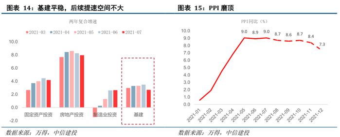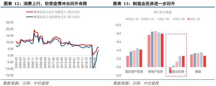 上半年经济数据中较为强势的数据是出口和房地产投资两个分项,下半年这两个分项有下行压力。今年上半年出口增速保持高位主要来自全球需求共振复苏,当前美国经济仍在修复,短期出口仍有一定支撑,7月我国出口增速录得13.1%(两年复合增速),但下半年随着全球经济触顶,出口下行压力逐步增加。房地产投资7月录得 7.9 %,下半年在监管政策趋严的情况下,地产投资也将逐步回落。