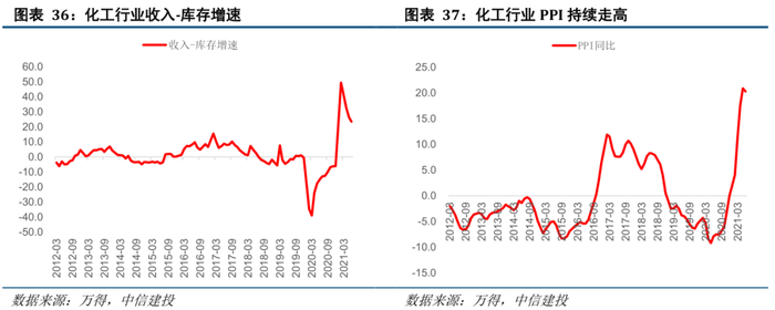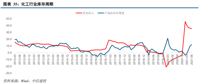 化工行业处于主动补库存阶段。化工行业收入处于历史高位,产成品库存增速上行,价格处于景气区间,同时产能受到环保的限制,扩张受限。在全球复苏的背景下,化工行业生产增速上半年呈现上行趋势。当前看,价格对化工行业仍有一定支撑,但化工行业更接近下游需求,需要关注下半年需求的变化。