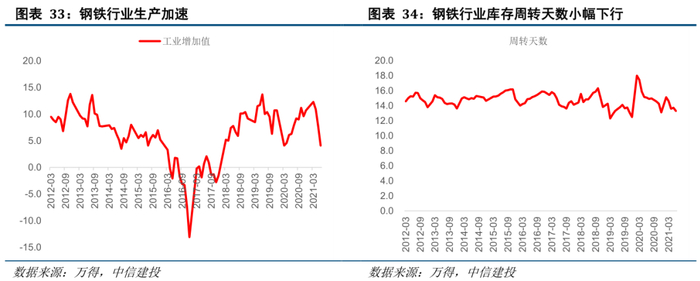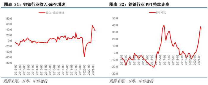 钢铁行业处于主动补库存阶段。钢铁行业收入增速处于历史高位,产成品库存增速上行。上半年全球需求复苏和碳中和共同推升钢铁行业的景气度和关注度。1-5月钢铁行业量价齐升,行业景气度大幅改善。5月下旬开始价格调控,7月份中旬限产加码。钢铁行业后续走势仍要看环保、碳中和政策的执行力度。
