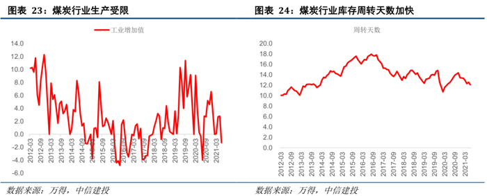 煤炭行业处于被动去库存阶段。从煤炭行业的营业收入和产成品库存增速来看,煤炭行业的收入增速较高,且产成品库存不断下行。煤炭行业仍然处于被动去库存阶段。与宏观环境相关的指标来看,煤炭价格仍有向上的动力,但工业生产受到环保、产能的影响,供给相对紧张。产能叠加碳中和,我们认为在未来3-5年,电气终端化对重点区域的煤炭需求有强力支撑。煤炭行业今年以来周转速度提高,已确保供应,但供需紧平衡状态下半年将延续。