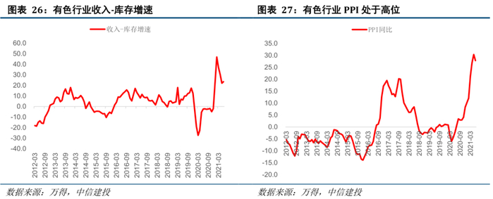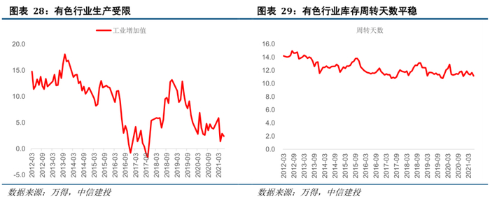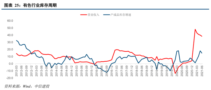 有色行业处于主动补库存阶段。有色行业营业收入高速增速,5、6月份受高基数影响回落,但符合增速接近40%。同时,产成品库存增速回升。有色金属价格在5月触顶后,6、7月份回落,但处于历史高位。今年以来,行业周转效率小幅提升。工业生产2020年以来保持一个相对较低的增长。作为碳中和重点行业,一方面产能受到限制,另一方面需求稳定,中长期行业景气度向上。下半年在有色价格高位的情况下,依然相对较强。