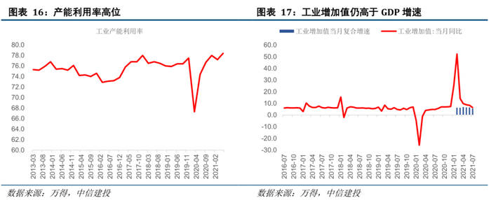 生产方面,大宗商品价格持续在高位震荡,PPI上行概率较低,处于持续磨顶状态。工业产能利用率处于近10年的高位。7月工业增加值 5.6%(两年复合增速)仍高于二季度GDP复合增速。整体上看,生产仍是在高速运作状态。