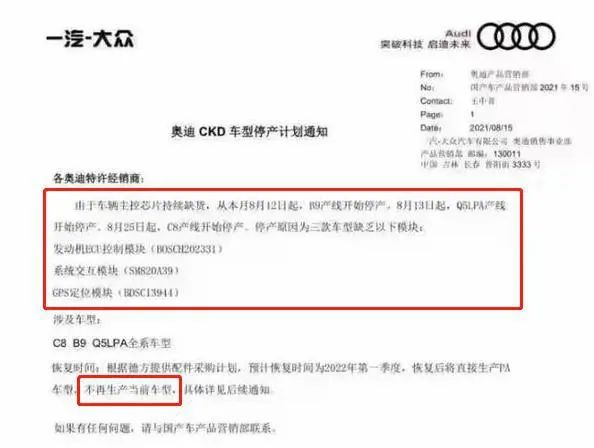 8月18日,一则疑似一汽-大众奥迪发布的关于“奥迪CKD车型停产计划通知”流出。通知内容显示,由于车辆主控芯片持续缺货,从8月12日起,B9产品线开始停产;8月13日起,Q5L PA产品线开始停产;8月25日起,C8产品线开始停产。上述三款车型之所以停产,主要是由于缺乏发动机ECU控制模块、系统交互模块、GPS定位模块。