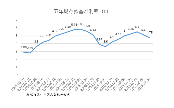 四是银行存款利率没有大的变化。这一期间中国五年期存款利率虽然经历了两个“波段”,但都是在2.88%-5.85%之间波动。1999年-2012年中国银行五年期基准利率变化详见下图。