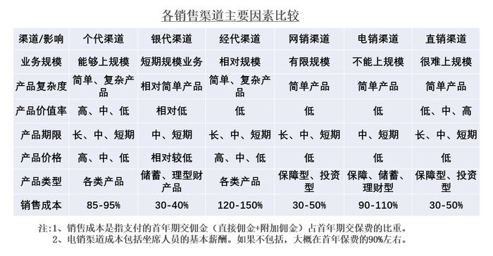 寿险公司自己可以掌控的渠道是直销渠道、个人代理人渠道或有股权关系的代理渠道(如银行系保险公司)。相对不容易掌控的渠道是中介代理渠道,包括银邮渠道、网销渠道。各个渠道都有各自的特点,详见下表。