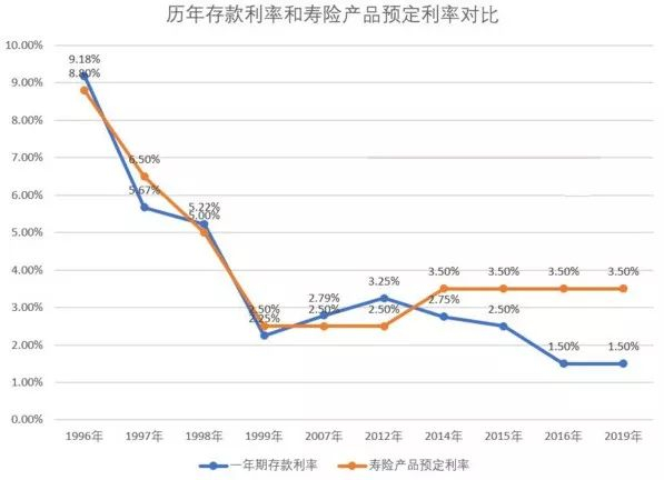 短短的3年时间,银行一年期利率从最高的10.98%直接降至2.25%!保险公司都傻了眼。整个行业卖出去的高利率产品基本都是固定的、不能更改的,而且要持续几十年,甚至终身。2000年,行业保险资金运用的收益率只有3.14%。已经开始形成利差损。据2003年高盛预计[2],三大寿险公司的潜在利差损约在320亿元至760亿元,后来,根据上市后披露的数据显示,这其实是一个相对保守的估计。至今有的公司还没有消化完当时留下的利差损。1996年-2019年银行存款利率与寿险产品定价比较详见下图。