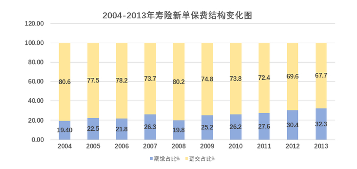 趸交保费一经推出,立即成为市场的主流缴费方式。从现有的数据可以看到,2004年,趸交保费已经占到新单保费的80%,尽管以后开始下降,但到2013年仍然是保费收入的主要方式,占比仍然达到67%。2004年-2013年寿险新单保费结构详见下图。