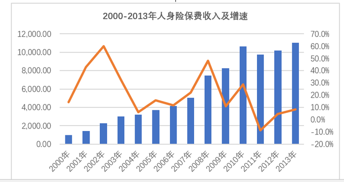 这一时期,人身险保费收入获得快速发展,由2000年保费收入2274亿元,增长到2013年的11009亿元。年复合增长率达到了双位数11.9%。实现了人身保险保费收入首次突破万亿元。2000年-2013年人身险保费收入及增速详见下图。