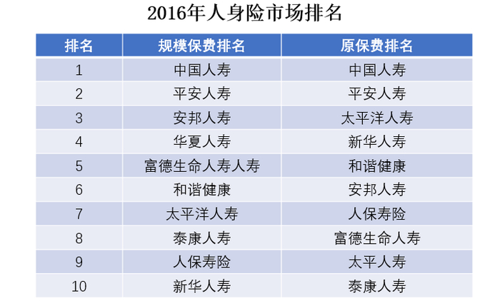 在原本大型险企一统天下的市场里,中短存续期产品给一些中小寿险公司一个“跳跃式”发展的机会,快速地扩大了自己的业务。例如2015年,生命人寿规模保费达1600亿元,较2014年的700亿元攀升了1倍还多。另一方面,一些公司凭借“资产驱动负债模式”采取激进的投资策略和中短存续期产品,得以在短时间内异军突起,实现了“弯道超车”,惯常所见的“老三家”、“老六家”的江湖格局荡然无存,按规模保费的市场排名进入前三位,超过老字号的新华、太保寿险,甚至平安一度被挤出寿险老二之位。2016年人身险市场排名详见下表。