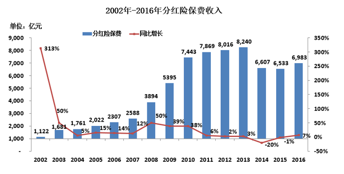 2002年分红险保费收入1121.7亿元,占当年人身险保费收入的49.3%,占新型寿险保费份额的90%以上,成为中国寿险业快速增长的主要标志之一。各大寿险公司也纷纷推出各种类型的分红保险,覆盖了储蓄、养老、医疗、少儿教育等各个方面。2003年全国分红保险保费收入1681.22亿元,占寿险保费总量的63%。到2013年,分红险保费收入已经到达8240亿元。为人身险保费收入过万亿元功不可没。2002年-2016年中国分红险保费收入及增速详见下图。