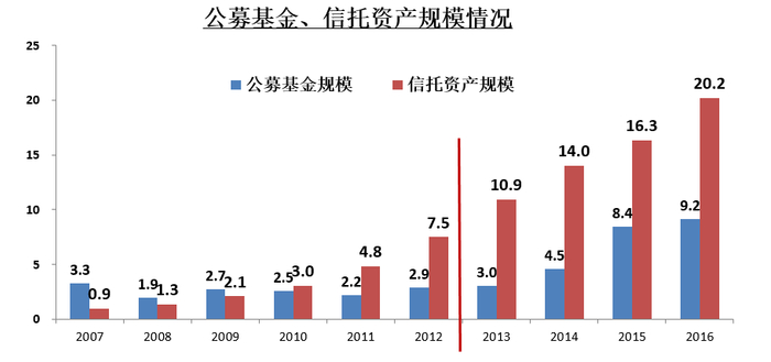 三是理财产品快速发展。这一时期,随着资本市场的发展,中国储蓄、基金、债券、P2P等理财产品都获得快速的发展。仅信托资产规模就从2011年的7.5万亿元增长到2016年的20.2万亿元。公募基金从2012年的2.9万亿元增长到2016年的9.2万亿元。公募基金、信托资产规模详见下图。