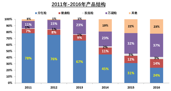 万能险在资产驱动负债模式下,通过高结算利率、随时可以赎回满足了客户投资时间短收益高的预期,在2015、2016两年成为市场增长最快的产品,分别占比高达32%和37%。万能险一时成为国家领导关注的、资本市场热议的、行业内争议的产品。随着险资举牌等事件和资产负债久期错配等问题浮出水面,监管部门加大了对万能险资金运用的监管力度,2017年,万能险保费增长开始显著下降。2011年-2016年人身险产品结构详见下图。