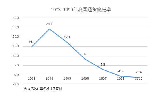 一是通货膨胀。中国从1991年的通货膨胀是3.4%,而到了1994年达到最高点24.1%,以后才开始回落。1993年-1999年中国通过膨胀率详见下图。
