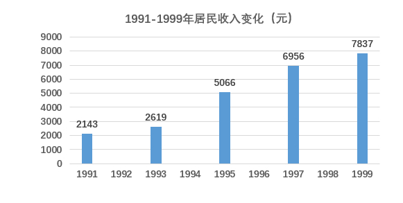 三是居民收入大幅增加。这一时期,居民收入由2143元增加到7837元,几乎翻了3.5倍。1991年-1999年中国居民收入增长详见下两图。
